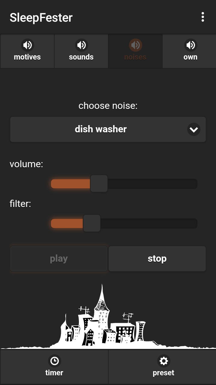 Select the time from the corresponding menu and the remaining time will be displayed in seconds. If you do not want the tones to fade out continuously, but want to maintain their volume and stop them at the end of the time span, uncheck "fade out". Press "start" to begin. To end the timer, press "stop". All tones are stopped and the timer is reset to "0". After the timer has run out, the "repeat once more" button becomes available. This restarts the most recently set tones including volume and the last time the timer was used.